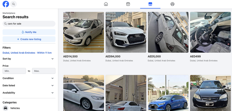 Facebook Marketplace and UAE car groups such as "Cars for Sale Dubai" give you free access to thousands of local buyers. Facebook earns money from ads, not from seller fees.